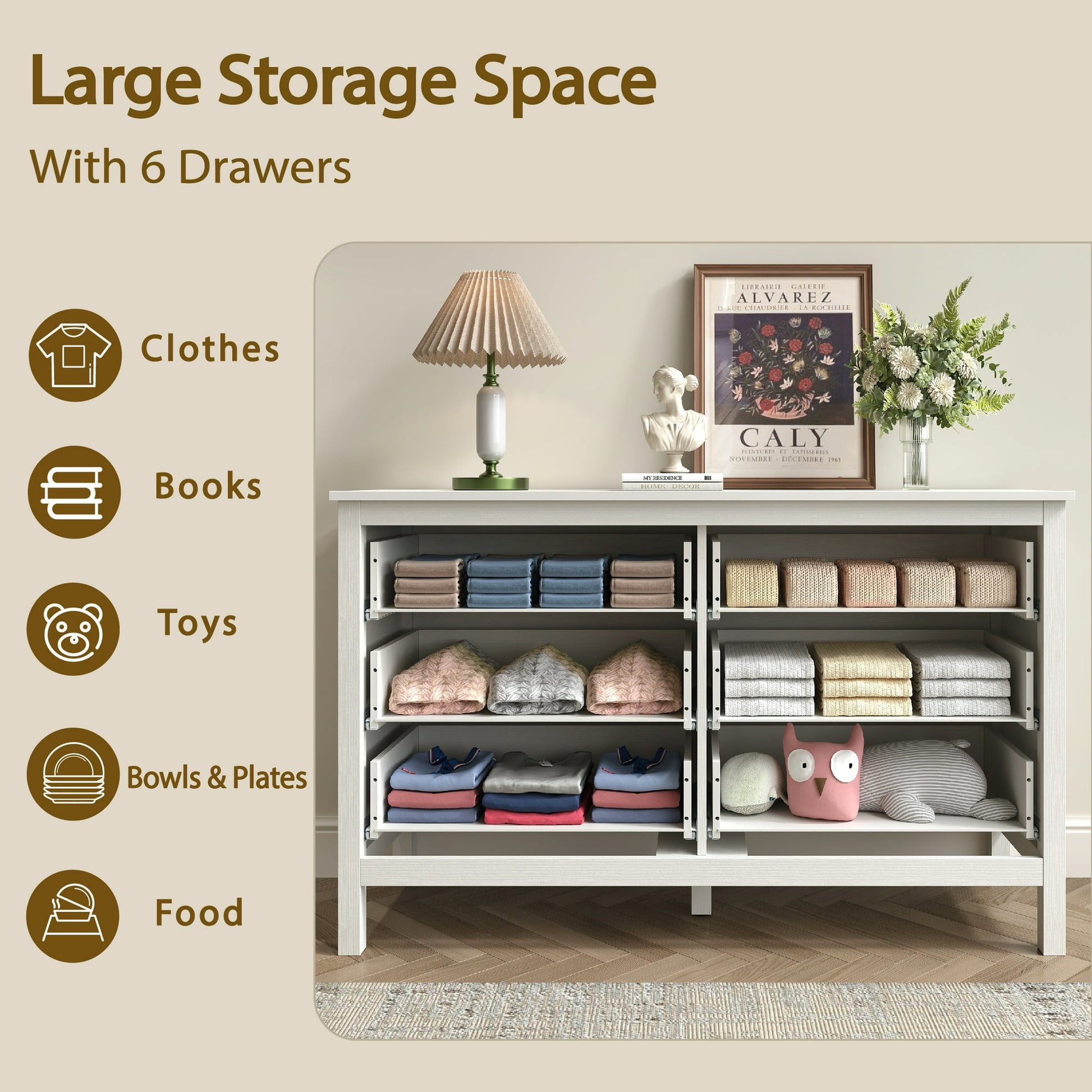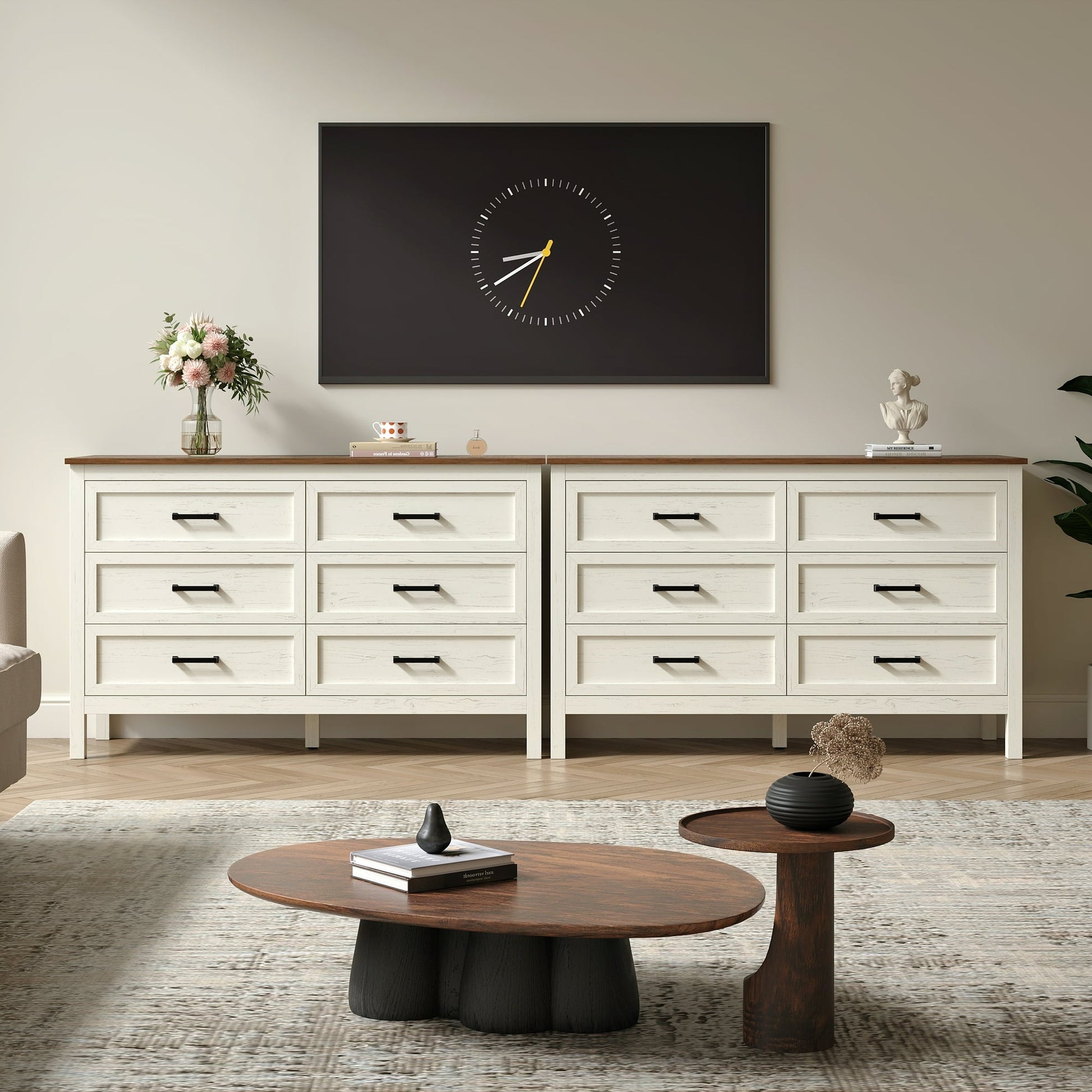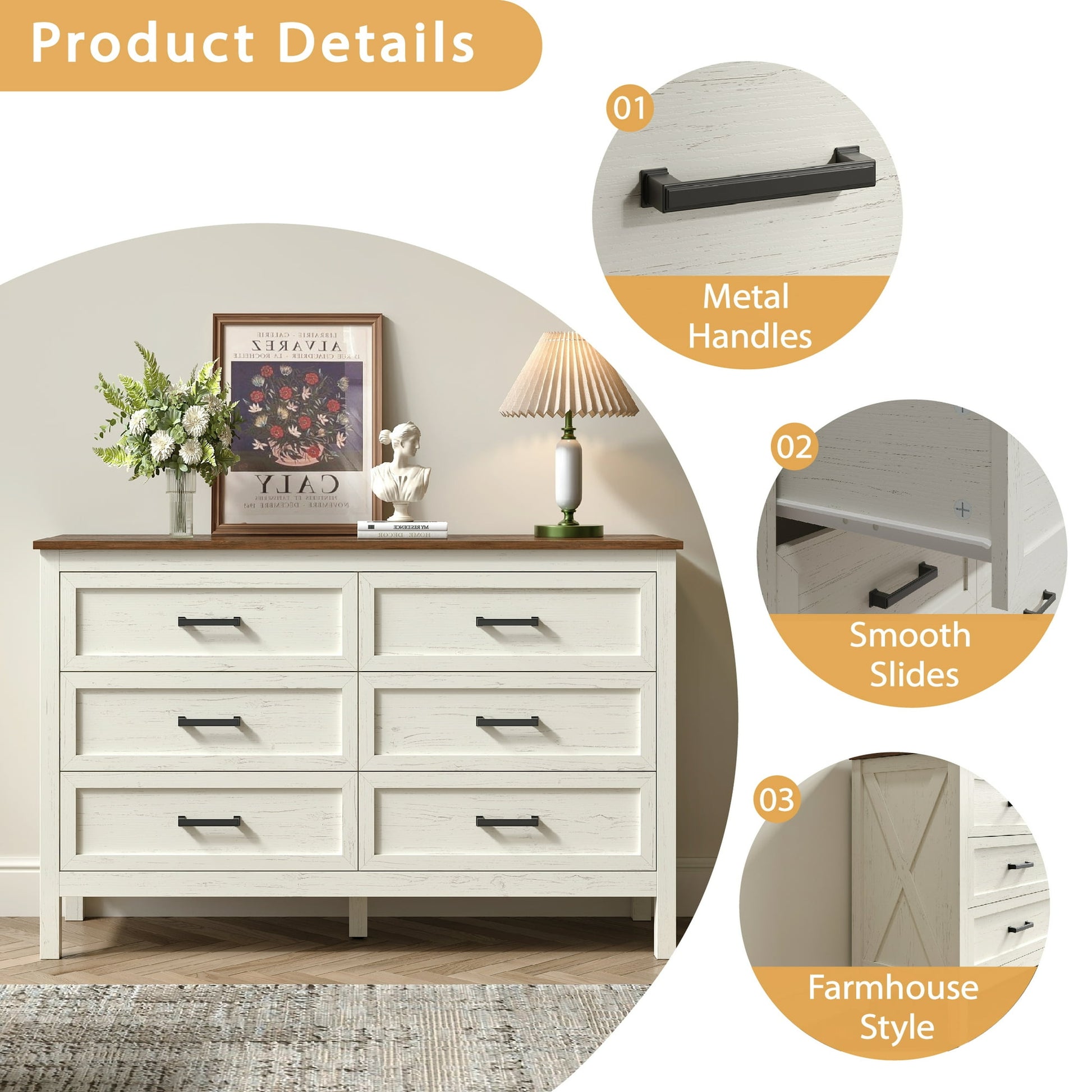 YouTrend 6 Drawer Farmhouse Dresser,Wood Adult Rustic Chest of Drawer with Metal Handles for Bedroom Living Room Hallway,Burlywood & White