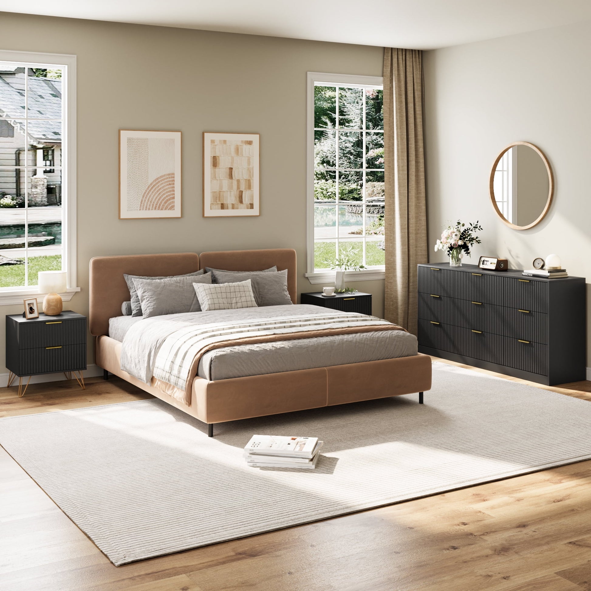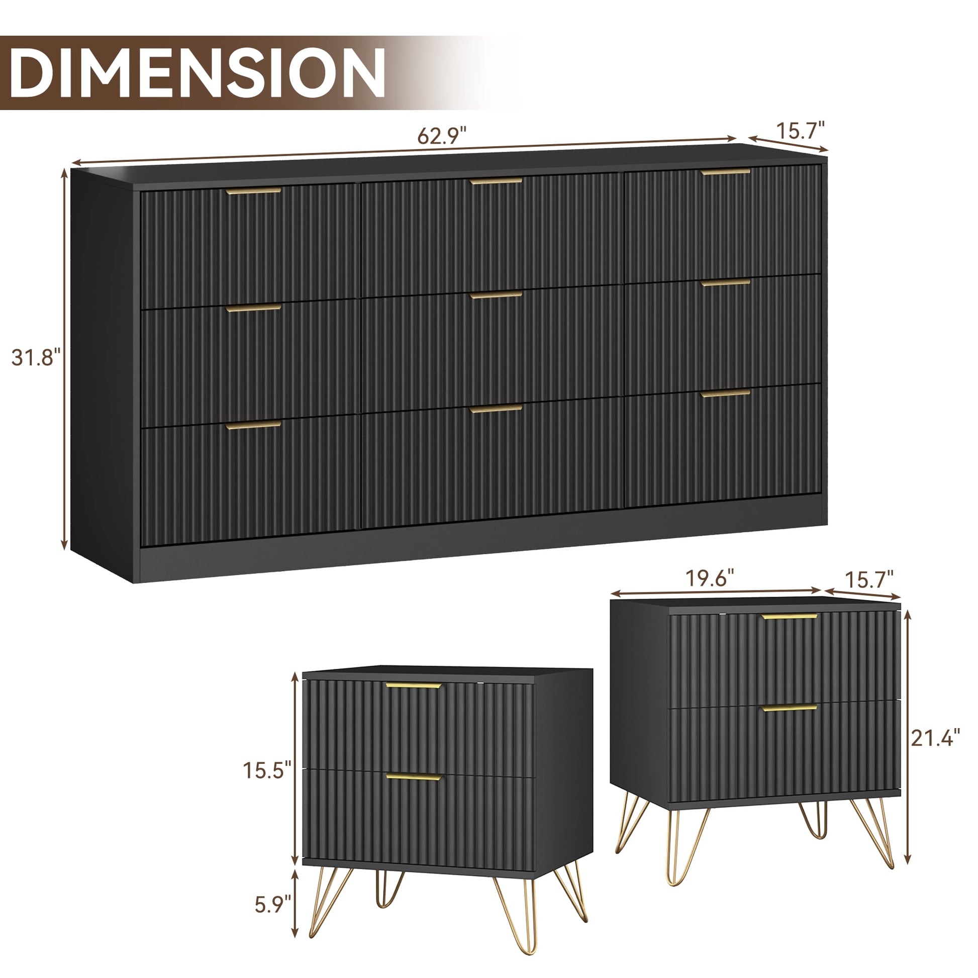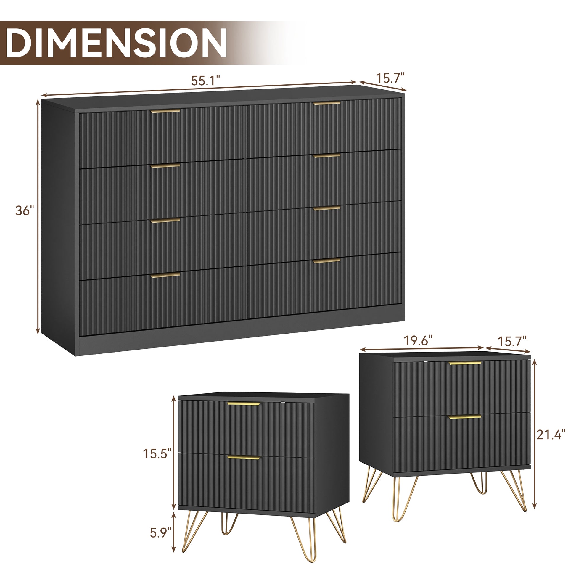 YouTrend bedroom furniture set (dresser + nightstands) boasts a unified recessed design, paired with gold-tone metal handles and legs¡ªblending classic aesthetics with modern flair, balancing style and function.It offers ample storage: a deep-drawer dresser and two double-drawer nightstands organize clothes and daily essentials, ending clutter.Crafted with upgraded craftsmanship, durable engineered wood, metal handles and solid legs, each drawer supports up to 40 lbs for long-lasting use. Its smooth flat surface only needs a light wipe for daily cleaning.This modern set is multi-functional too¡ªworks as an entryway console or TV stand, fitting seamlessly into living rooms/hallways for space-saving style and practicality.