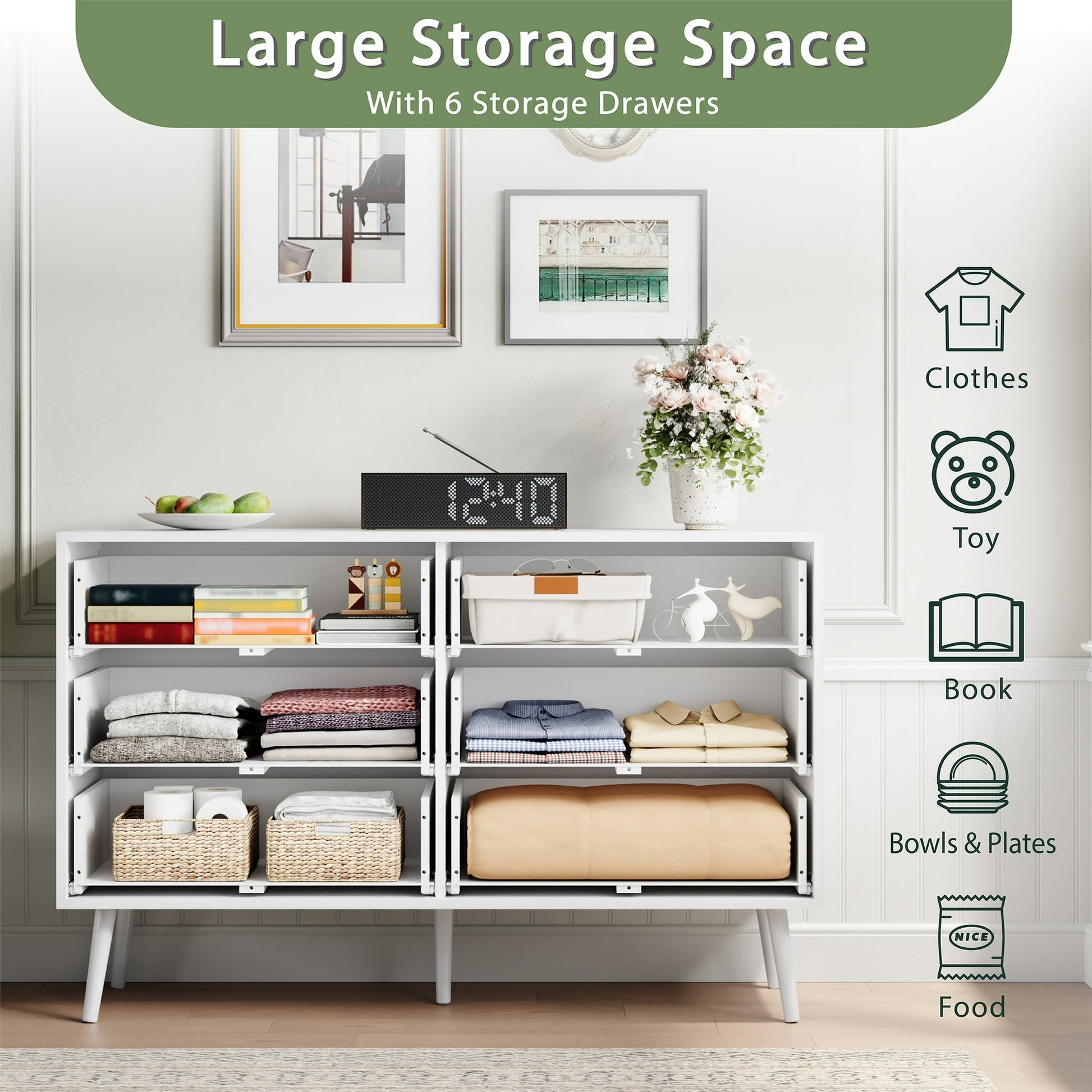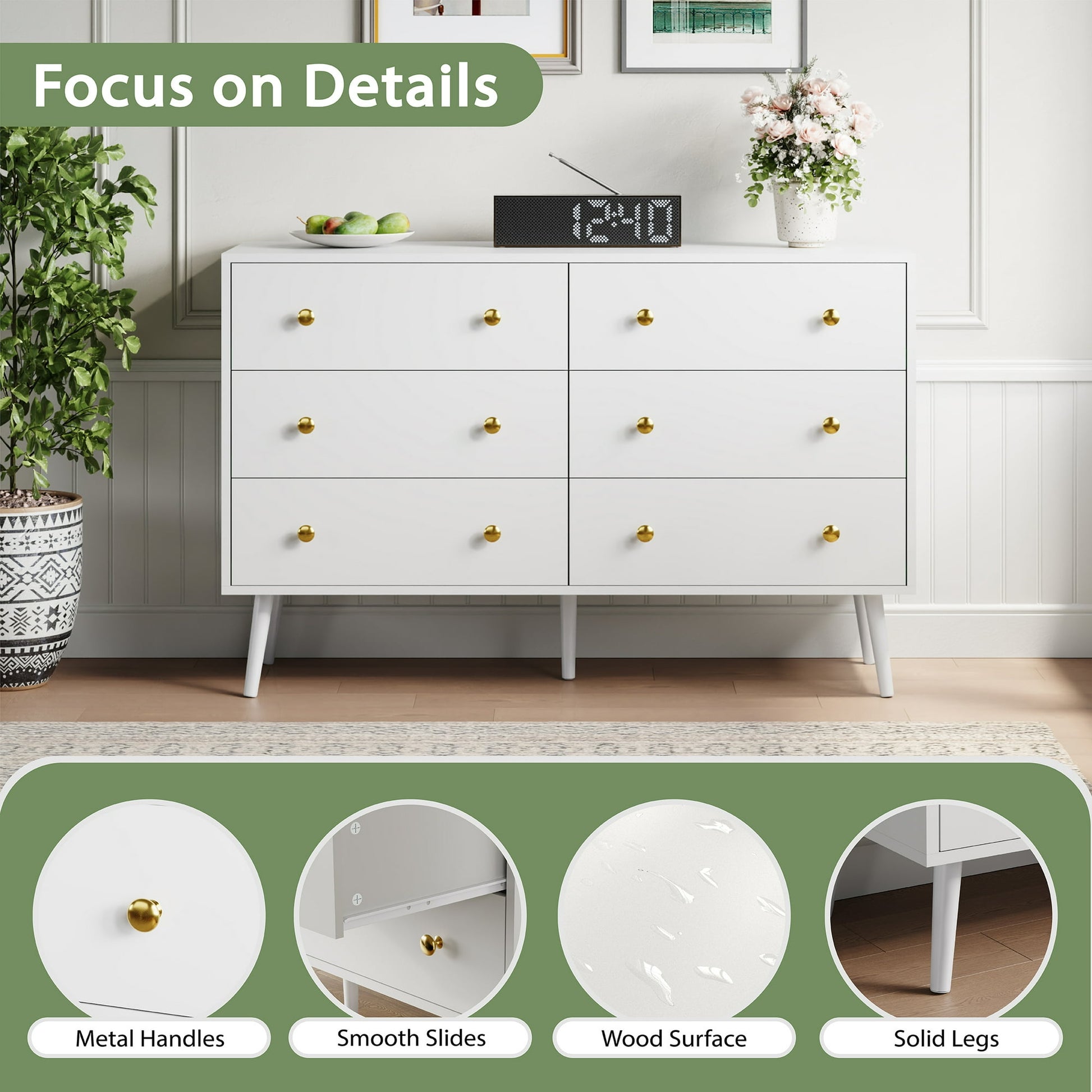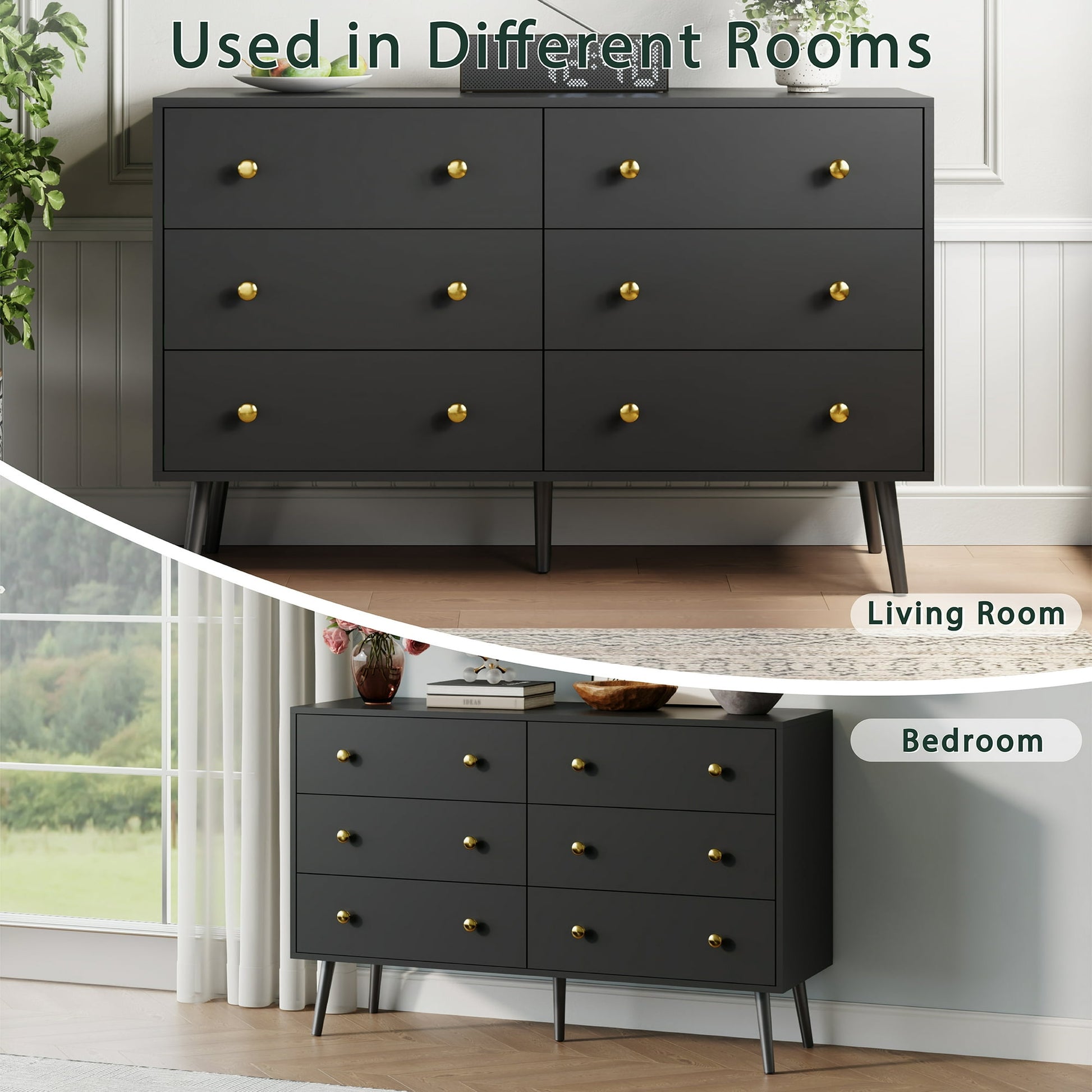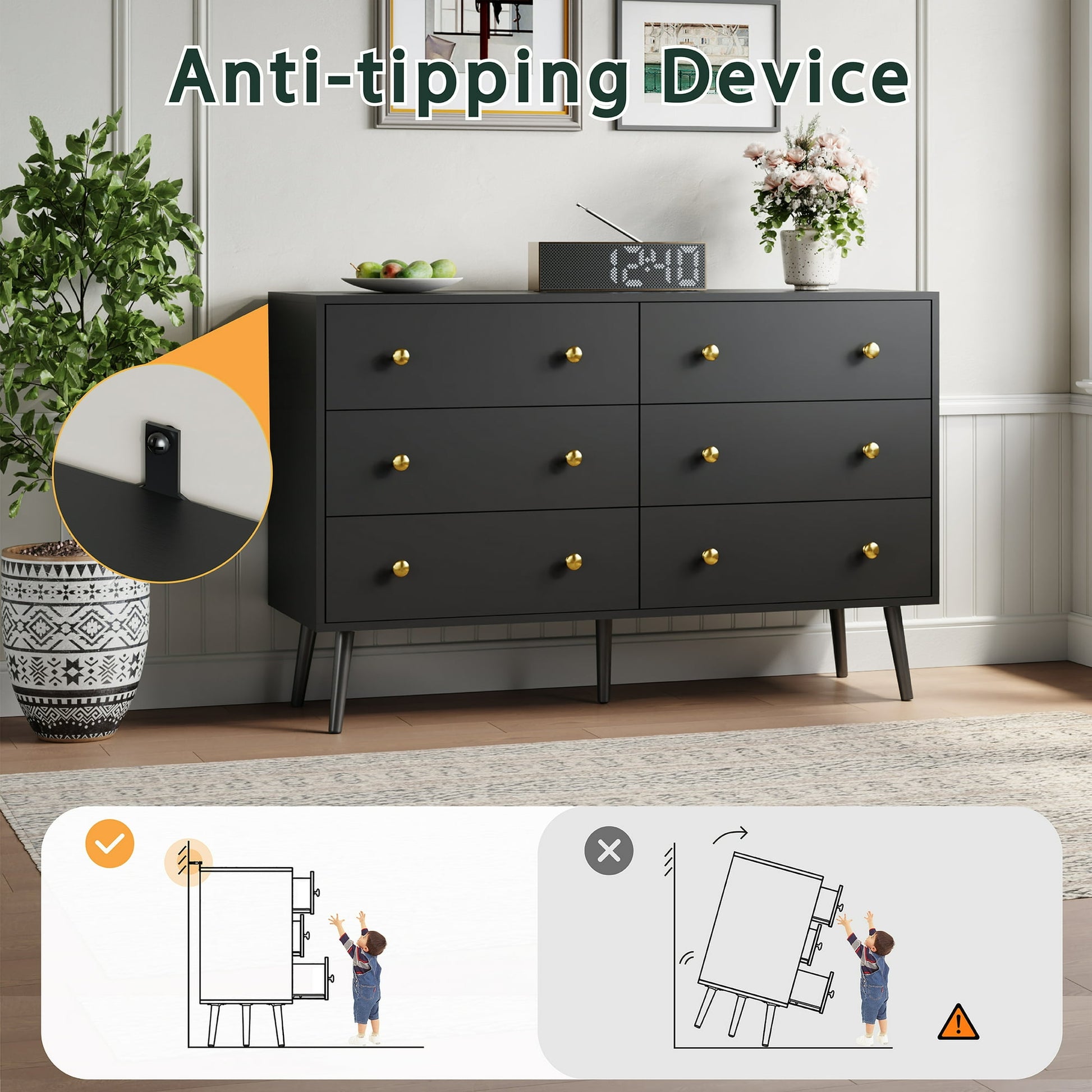 Keep all your spare bits and bobs out of sight whilst presenting a sleek aesthetic with this YouTrend dresser. This dresser has a spacious tabletop and 6 deep drawers to store your T-shirts, socks, pants, shirts and more, helping you keep your bedroom, guest room, and living room are organized. The golden handles exquisitely crafted, adding texture to this wooden dresser. Equipped with smooth metal drawer slides, the drawers of the closet dresser are effortless to open and close. The adult dresser for the bedroom is secured by a tip-over restraint device to reduce tip-over accidents for more safety. The height of the bottom of the dresser is convenient for daily cleaning. This dresser is made of high-quality wood, ensuring long-term durability, and is easy to clean. Hurry up and take it home!